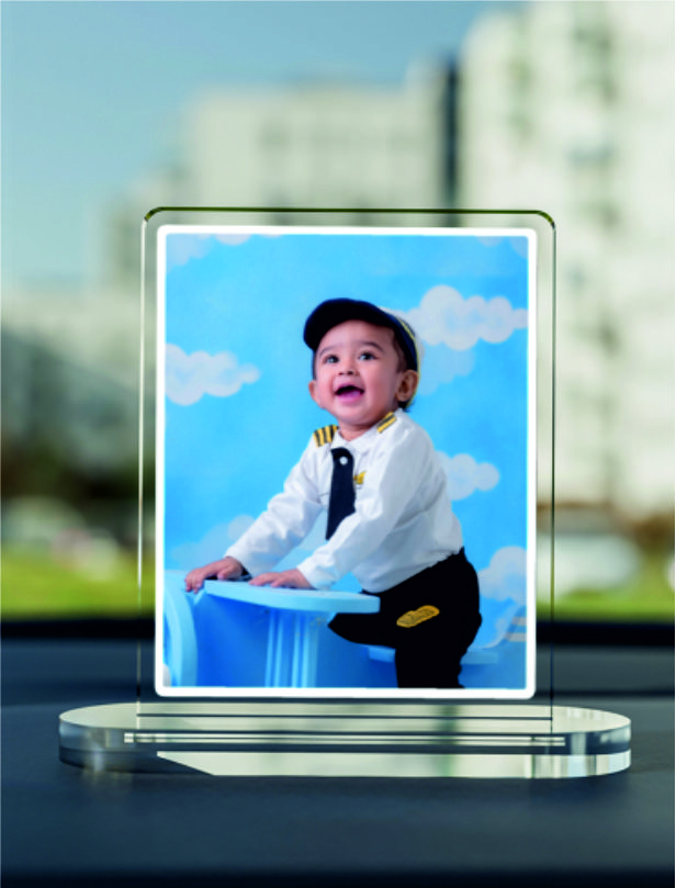 Custom printed acrylic standee for car dashboards. Personalised with your photo